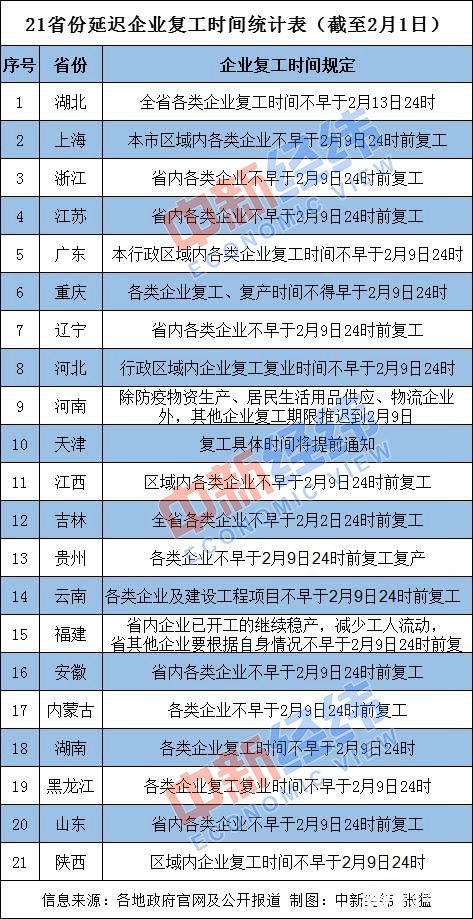 截至發(fā)稿時,湖南、廣東、上海、重慶、江蘇、浙江、河南、河北、山東、安徽、貴州、云南、福建、遼寧、內(nèi)蒙古等19省份區(qū)域內(nèi)企業(yè)復(fù)工時間不得早于2月9日24時,吉林不得早于2月2日24時,湖北不得早于2月13日24時。