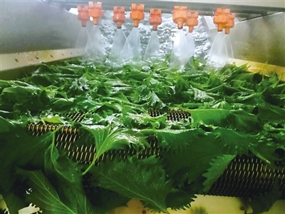 在紫蘇基地加工車間,20多名工人正在熱火朝天地忙碌著,采摘好的紫蘇葉在這里經(jīng)過清洗、精選、包裝等多道工序處理后,會按照不同品級進行精細化捆扎分類,然后被送入冷庫進行預冷,整個操作都是在無菌環(huán)境下進行。“現(xiàn)在臨時工、長期工加一起有20多人,5年來,我們在七圪臺村、什不斜氣村、什拉烏素村等周邊培訓了村民200人左右,他們每年農(nóng)閑時就會來基地打工,男工負責大棚管理、種植,女工負責采葉子、分葉子、包葉子?!卑合蛴浾呓榻B道。