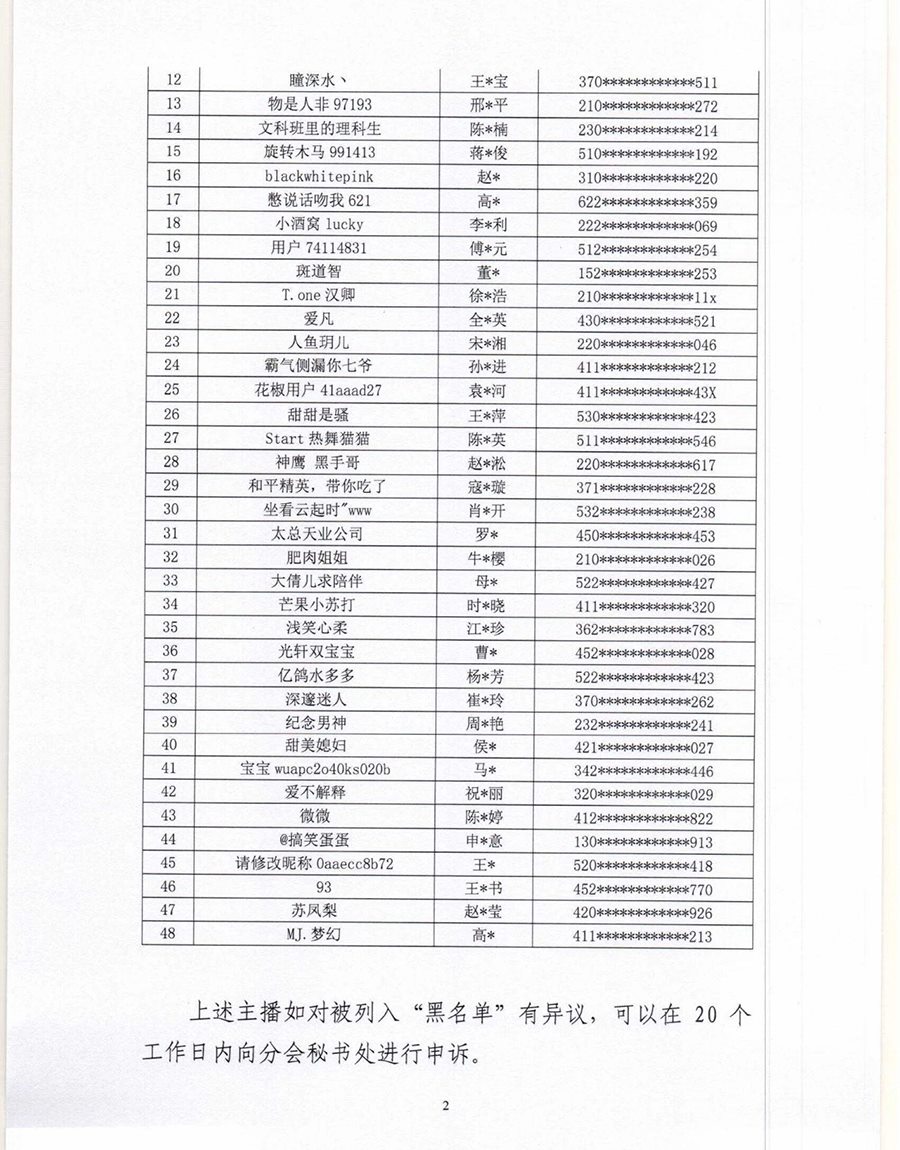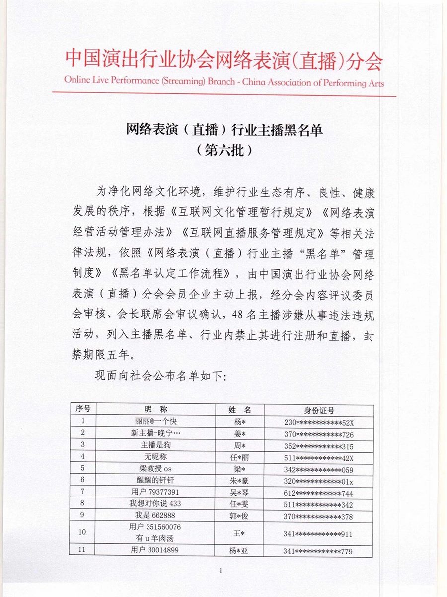 根據(jù)《互聯(lián)網(wǎng)文化管理暫行規(guī)定》《網(wǎng)絡(luò)表演經(jīng)營活動管理辦法》《互聯(lián)網(wǎng)直播服務(wù)管理規(guī)定》等相關(guān)法律法規(guī),按照《網(wǎng)絡(luò)表演(直播)行業(yè)主播“黑名單”管理制度》《黑名單認(rèn)定工作流程》規(guī)定,中國演出行業(yè)協(xié)會網(wǎng)絡(luò)表演(直播)分會現(xiàn)向社會公布第六批主播黑名單,被列入黑名單的主播將在行業(yè)內(nèi)禁止注冊和直播,封禁期限5年。(總臺央視記者曹巖)