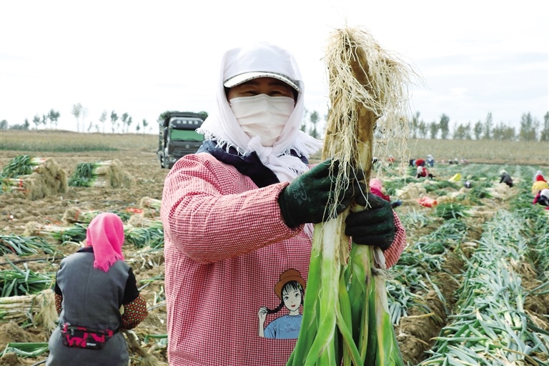 正在忙著收蔥打捆的村民于新穎說(shuō):“看這蔥長(zhǎng)得多好!”
