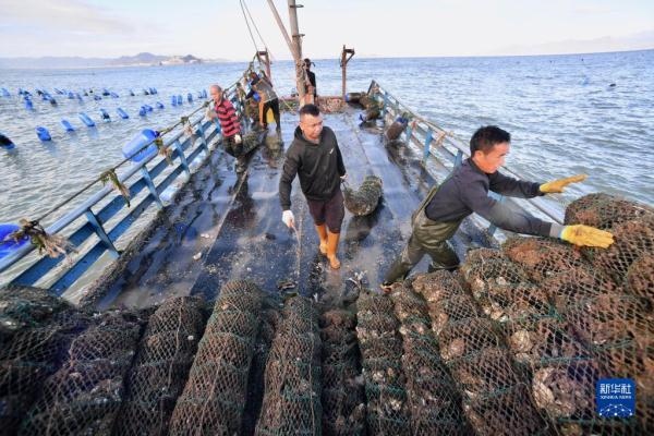 在福建省霞浦縣三沙鎮(zhèn)海域,采蠔工轉(zhuǎn)運(yùn)采收的生蠔(10月22日攝)。新華社記者 姜克紅 攝