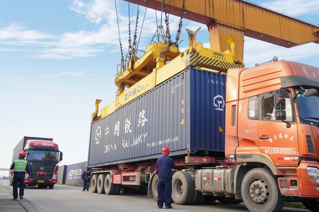 圖為南寧國際鐵路港內集裝箱吊裝運輸作業(yè)現(xiàn)場。(中國鐵路南寧局集團有限公司供圖)