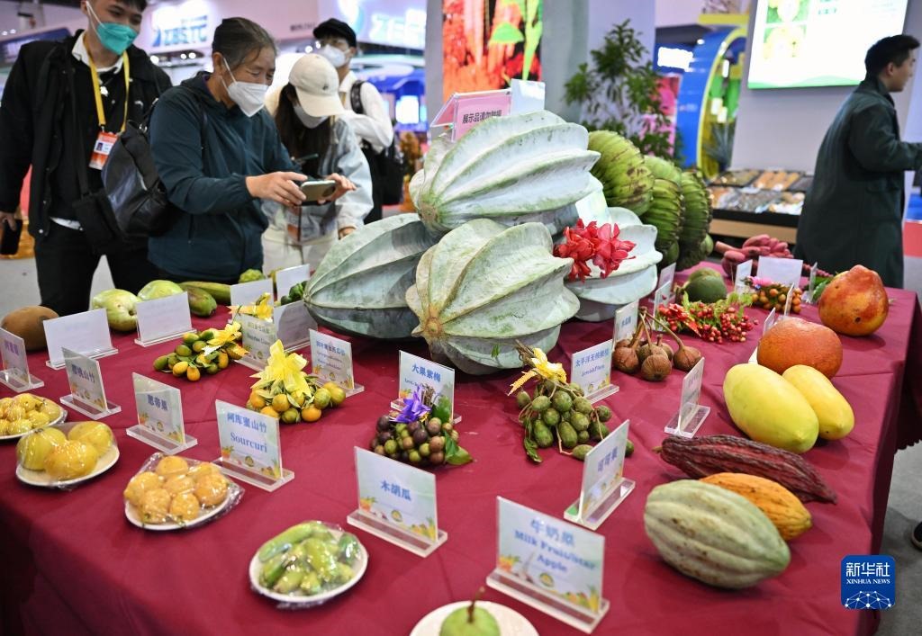 12月15日,觀眾參觀世界熱帶水果之窗展臺展示的熱帶水果。新華社記者 郭程 攝