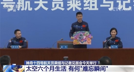 記者會(huì)上,航天員陳冬收到了來(lái)自家鄉(xiāng)特殊教育學(xué)校孩子的一幅畫作。