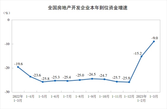 1—3月份,房地產(chǎn)開發(fā)企業(yè)到位資金34708億元,同比下降9.0%。其中,國內(nèi)貸款4995億元,下降9.6%;利用外資8億元,下降22.7%;自籌資金10171億元,下降17.9%;定金及預(yù)收款11909億元,下降2.8%;個(gè)人按揭貸款6188億元,下降2.9%。