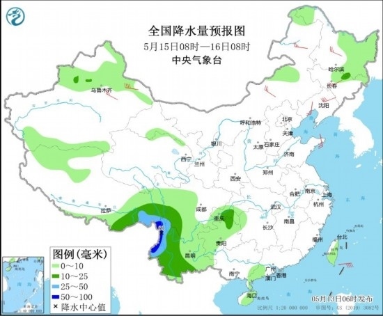5月15日08時至16日08時,云南中西部、西藏東南部、川西高原南部、重慶南部、貴州北部等地的部分地區(qū)有中到大雨,其中,西藏東南部、云南西部等地部分地區(qū)有暴雨(50~60毫米)。內(nèi)蒙古、東北地區(qū)、新疆北部等地的部分地區(qū)有4~6級風,其中,新疆東部部分地區(qū)有6~7級風,東部山口局地陣風風力可達10級左右。