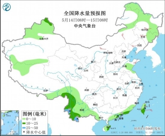 5月14日08時至15日08時,新疆北疆北部、西藏東南部、云南西部、廣東中南部沿海、臺灣島、海南島等地的部分地區(qū)有中到大雨。新疆北部、內(nèi)蒙古、東北地區(qū)、山東半島等地的部分地區(qū)有4~5級風。