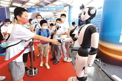 在北京亦創(chuàng)國際會展中心舉行的2022世界機器人博覽會上,小觀眾在與智能服務(wù)機器人握手。陳曉根攝(人民視覺)