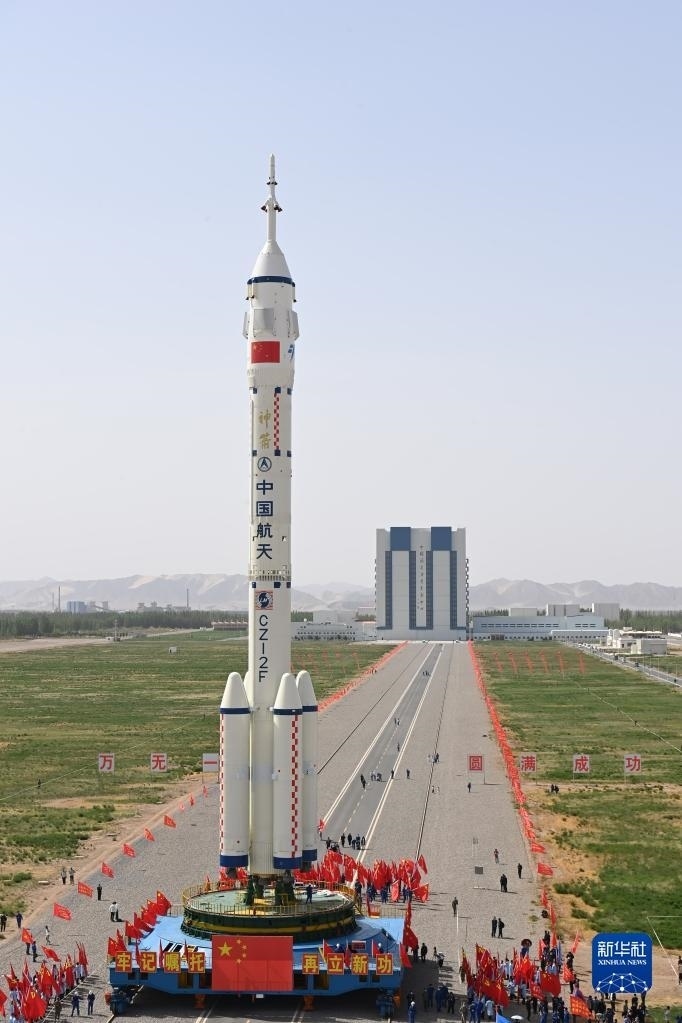 5月22日,神舟十六號(hào)載人飛船與長(zhǎng)征二號(hào)F遙十六運(yùn)載火箭組合體準(zhǔn)備轉(zhuǎn)往發(fā)射場(chǎng)。新華社發(fā)(汪江波 攝)