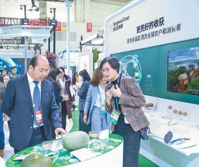 觀(guān)眾(左)在先正達(dá)集團(tuán)展臺(tái)參觀(guān)。本報(bào)記者 白真智攝