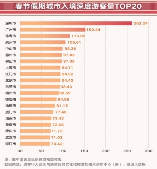 春節(jié)假期期間, 136.6萬人的入境深度游客(來自境外,并在大陸城市停留6小時(shí)以上的游客人數(shù),以下簡稱“深度游”)的大數(shù)據(jù)樣本顯示,入境游客量前20的城市共接待入境深度游客87.0萬人。