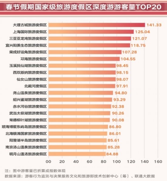 春節(jié)假期,全國63家國家級(jí)旅游度假區(qū)共接待深度游客(在度假區(qū)停留2小時(shí)以上的游客人數(shù),本部分以下簡稱“深度游”)793.4萬人,按可比口徑較2023年增長了42.3%,增長顯著。其中深度游前20的度假區(qū)共接待478.5萬人。