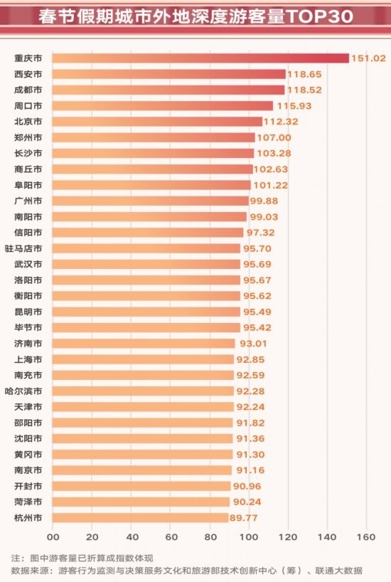 熱點(diǎn)城市假期依舊火爆。熱點(diǎn)城市在春節(jié)假期依舊是旅游市場的贏家,重慶、西安、成都、北京、鄭州位列外地深度游前5位,長沙、廣州、武漢、濟(jì)南、上海進(jìn)入了外地深度游前20位。