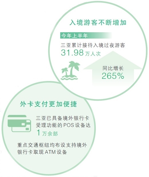 截至目前,三亞已具備境外銀行卡受理功能的POS設備達1萬余部,全市支持境外銀行卡取現(xiàn)的ATM設備499臺,貨幣代兌點59個,現(xiàn)金“零錢包”發(fā)放超6.6萬個。其中,機場、動車站、郵輪碼頭等重點交通樞紐均布設支持境外銀行卡取現(xiàn)ATM設備,機場航站樓內支持境外銀行卡支付商戶覆蓋率達99%,大東海旅游區(qū)周邊商戶POS設備80%以上支持境外銀行卡支付……