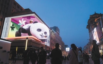 北京市王府井步行街百貨大樓墻體,裸眼3D大屏畫(huà)面吸引人們觀看。