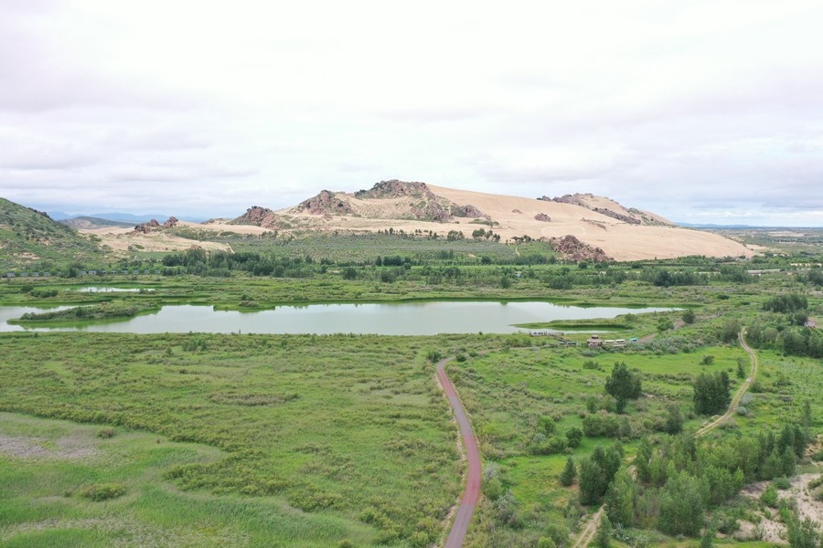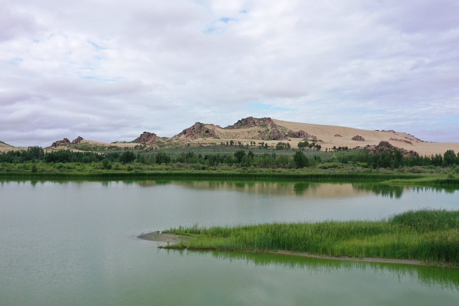 玉龍沙湖位于內蒙古赤峰市翁牛特旗,這里集沙漠、怪石、古樹、奇峰、草原、湖泊、濕地等于一身,5萬畝草原與茫茫的科爾沁沙地相連,綠洲掩映,湖光山色,形成沙海相連的奇特景觀。