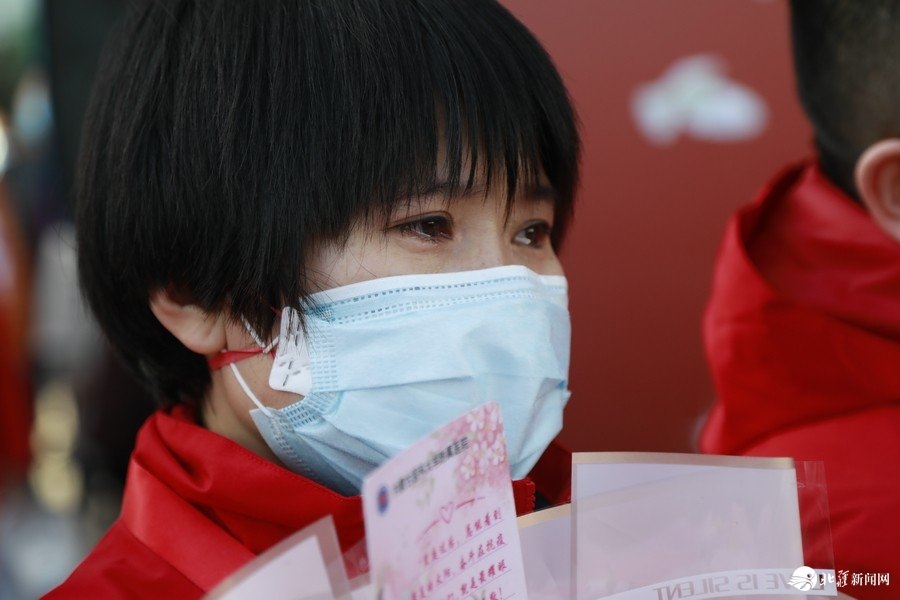 醫(yī)療隊隊長張卿代表發(fā)言,她難掩激動的心情,喜極而泣。她說,整個醫(yī)療隊用實際行動踐行了使命,沒有辜負所有人的期待,圓滿完成此次援鄂任務。她表達了對自治區(qū)衛(wèi)健委、學校及醫(yī)院后方關(guān)心與支持的感謝,表達了對所有附院大家庭和親人們的思念與感謝,“親人們,兄弟姐們們,我們平安回來了!你們的支持,是我們前行的最大動力!”