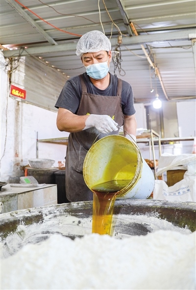 “我們堅(jiān)持手工制作,就是想留住這個味道!”常三文是隆盛莊月餅制作技藝非遺傳承人,他帶記者來到了打月餅的作坊。一個約60平方米的房間里有兩個大鐵鍋,一個鐵鍋里熬著糖水,另一個鐵鍋用來和面。一名男工將面粉、熟胡麻油、糖水等按比例倒入鐵鍋,然后用鐵鏟攪拌起來。鐵鍋旁邊是一個做月餅的大案板,4個女工稱重、分劑、做胚、擺放,各自忙活著。常三文的兒子常曉峰負(fù)責(zé)將擺放好的月餅放進(jìn)燒爐火的烤爐,計(jì)時、下簽子、刷油……直至月餅烤制完成出爐。