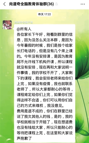 根據(jù)謝女士提供的轉(zhuǎn)賬證明和聊天截圖記者注意到,“尚道奇全腦教育體驗(yàn)群”1月15日發(fā)布的一則通知稱,今年暑假,機(jī)構(gòu)老師曾挨個(gè)給家長(zhǎng)打電話通知上課,但是沒有幾個(gè)來(lái)上課的,加上教育局不允許線下機(jī)構(gòu)開課,所以課程遲遲沒有安排。并稱學(xué)校賠錢了,沒有錢退給大家,只能耐心等待疫情結(jié)束后安排上課,如果家長(zhǎng)覺得不合適,可以用自己的方式維權(quán)?!八恼f(shuō)辭明顯前后矛盾,暑假期間說(shuō)課件損毀,現(xiàn)在又說(shuō)沒學(xué)生上課?!敝x女士氣憤地說(shuō),和她遭遇同樣情況的還有30多名家長(zhǎng),399元雖然不是大數(shù)目,但這樣欺騙大家實(shí)屬不該。