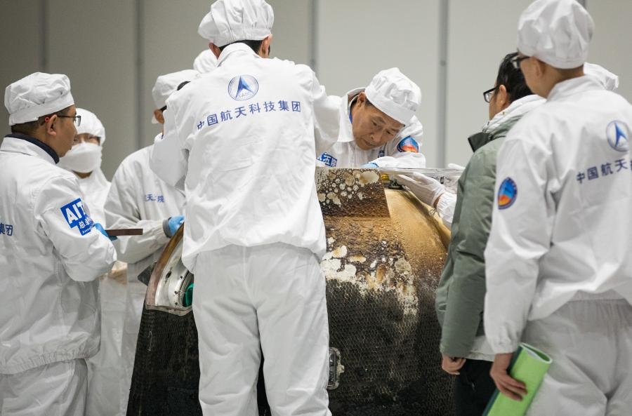 2020年12月17日,在中國(guó)航天科技集團(tuán)五院,科研人員打開嫦娥五號(hào)返回器艙門,取出裝有月球樣品的容器并進(jìn)行稱重。新華社記者金立旺攝
