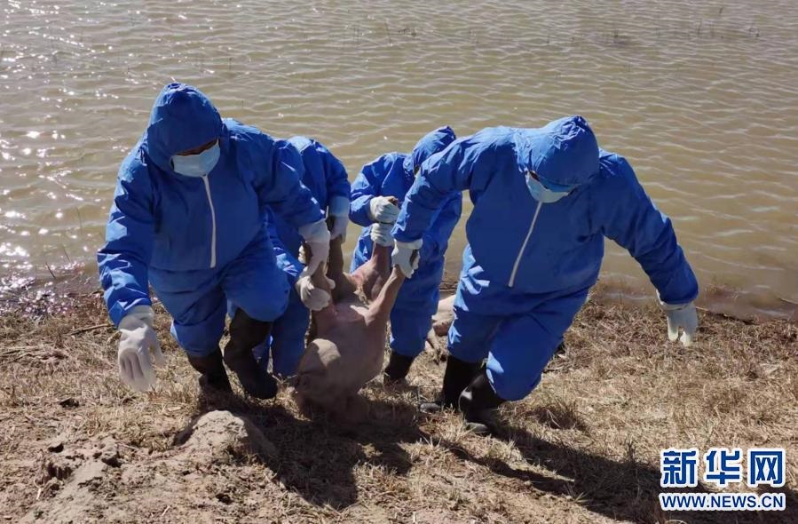 3月21日,當(dāng)?shù)卣块T(mén)派出的工作人員在達(dá)拉特旗黃河國(guó)堤內(nèi)收集死畜。新華社發(fā)