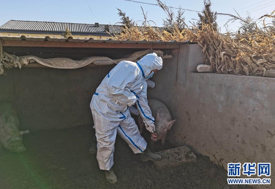 3月22日,達(dá)拉特旗疫控人員對(duì)農(nóng)戶養(yǎng)殖的生豬進(jìn)行檢測(cè)采樣。新華社發(fā)