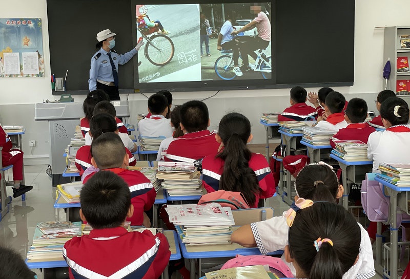 活動中,民輔警根據(jù)校園周邊道路交通實際,結(jié)合交通管理工作經(jīng)驗,圍繞文明行走、安全騎車、安全乘車等與學(xué)生們息息相關(guān)的交通安全知識進行講解。并聯(lián)系生活實際警示學(xué)生們要自覺做到“知危險、會避險”,不要在馬路上嬉戲打鬧、不要攀扶車輛、遠離大貨車、不要乘坐無資質(zhì)的車輛、不乘坐超員車、拼裝車、共享電動車等存在安全隱患的車輛。之后,又通過近期身邊的典型道路交通事故案例,以案說法,切實提高學(xué)生們的交通安全意識和自我保護能力。
