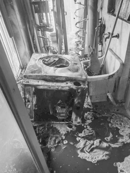 經(jīng)了解,起火點(diǎn)位于業(yè)主家的北陽(yáng)臺(tái),業(yè)主將吹風(fēng)機(jī)開(kāi)機(jī)對(duì)著陽(yáng)臺(tái)水管吹了整整一夜,該吹風(fēng)機(jī)發(fā)生故障著火后引燃了堆積的雜物,洗衣機(jī)被燒得只剩下骨架,玻璃窗戶受熱后完全破碎,雜物悉數(shù)被燒,水管、墻面也被熏黑。