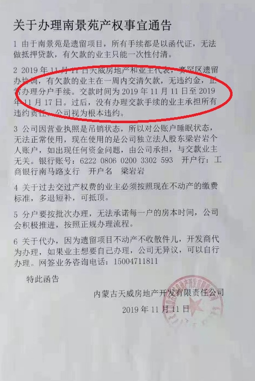 對(duì)于賈麗娟的說(shuō)法,南景苑小區(qū)的居民告訴記者:“2019年11月11日,天威房地產(chǎn)公司曾在小區(qū)張貼過(guò)一則關(guān)于辦理南景苑產(chǎn)權(quán)事宜通告,公告中已經(jīng)明確,2019年11月11日天威房地產(chǎn)和業(yè)主代表、賽罕區(qū)遺留辦協(xié)調(diào),有欠款的業(yè)主在一周內(nèi)交清欠款,無(wú)違約金,正常辦理分戶手續(xù)。這充分說(shuō)明了我們不需要在交納違約金暨滯納金,賈麗娟所說(shuō)的滯納金明顯與當(dāng)年的通告內(nèi)容相違背。再說(shuō),天威房地產(chǎn)公司營(yíng)業(yè)執(zhí)照處于吊銷狀態(tài),好多地方存在違約行為,按合同約定公司應(yīng)該賠償給居民的錢誰(shuí)來(lái)負(fù)責(zé)?”(北方新報(bào)正北方網(wǎng)首席記者 高志華 實(shí)習(xí)生 張子椒)