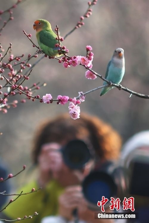2月20日,江蘇南京,牡丹鸚鵡在梅花山梅花樹上“賞”梅,吸引市民拍照。牡丹鸚鵡由南京一市民飼養(yǎng),每年在梅花盛開的時候,他都會帶著鸚鵡來到這里“賞”梅,同時也成為一景。 中新社記者 泱波 攝