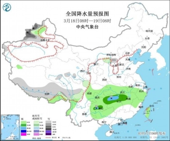 全國降水量預(yù)報圖(3月17日08時-18日08時)