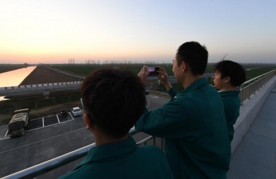 3月14日,在西平縣老王坡高標(biāo)準(zhǔn)服務(wù)中心的二樓平臺(tái),臺(tái)曉林(右)、王英凡和王仲琦(左)下班后在看夕陽(yáng)。