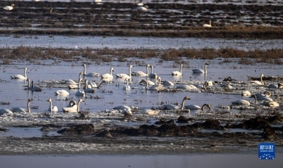 3月20日,在內蒙古自治區(qū)呼和浩特市托克托縣黃河沿岸,天鵝在水上棲息覓食。