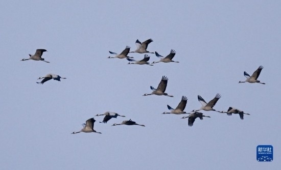 3月20日,在內蒙古自治區(qū)呼和浩特市托克托縣黃河沿岸,黑頸鶴在空中飛翔。