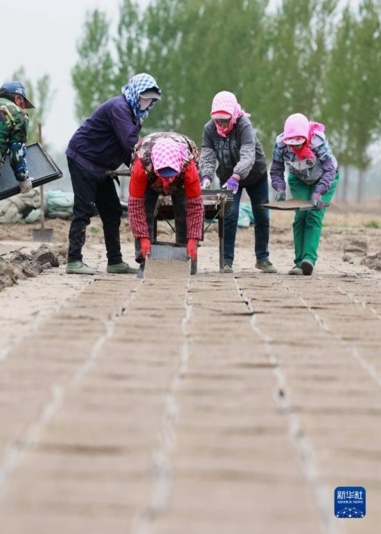 4月18日,唐山市豐南區(qū)西葛鎮(zhèn)的農(nóng)民在田間擺放育秧盤(pán)。