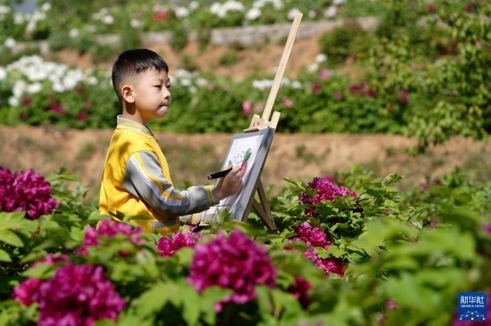 4月16日,小朋友在白臺(tái)峪村牡丹農(nóng)業(yè)產(chǎn)業(yè)園內(nèi)寫生。