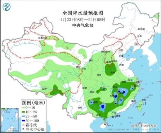 4月23日08時至24日08時,西藏東南部、青海東南部、甘肅西部、陜西北部、山西大部等地部分地區(qū)有小到中雪或雨夾雪,其中甘肅西部、山西中南部等地部分地區(qū)有大雪;、華北南部、黃淮西部、江淮南部、江南中東部、江漢東部、江南南部、西南地區(qū)東南部、華南北部和西部等地部分地區(qū)有中到大雨,其中,湖南南部、江西、廣西東北部等地部分地區(qū)有暴雨(50~90毫米)。內(nèi)蒙古西北部、黑龍江東北部、青海西部、浙江北部等地部分地區(qū)有4~6級風。東海中南部海域、臺灣海峽將有5~6級、陣風7級的東北風。
