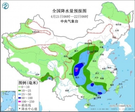 4月21日08時至22日08時,新疆沿天山高海拔地區(qū)和南疆南部、西藏北部和東部、青海東部、甘肅中南部、寧夏、陜西北部、山西中北部等地部分地區(qū)有小到中雪或雨夾雪,其中甘肅南部、山西西部局地有大到暴雪(10~18毫米);西北地區(qū)東南部、華北中南部、西南地區(qū)東部、江漢西部、江南中南部、華南北部和東部等地部分地區(qū)有中到大雨,其中,四川盆地東部、重慶西部、湖南南部、廣東東部等地部分地區(qū)有暴雨或大暴雨(100~120毫米)。內(nèi)蒙古東北部、黑龍江東北部、浙江北部等地部分地區(qū)有4~6級風。渤海海域、黃海海域、東海北部、臺灣海峽將有6~7級風,陣風8~9級。