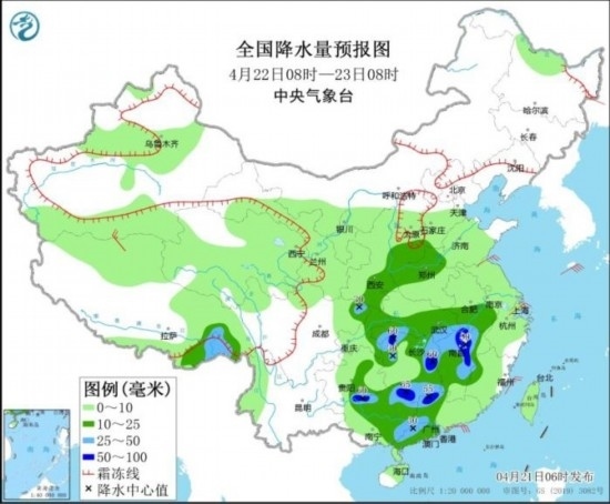 4月22日08時至23日08時,新疆沿天山高海拔地區(qū)和南疆南部、西藏東部、青海中南部、甘肅中南部、寧夏中北部、陜西中北部、山西等地部分地區(qū)有小到中雪或雨夾雪,其中甘肅中部、陜西北部、山西中南部等地部分地區(qū)有大雪;西藏東南部、華北南部、黃淮西部、江淮西南部、江漢南部、江南大部、重慶東北部、貴州東部、華南北部和南部等地部分地區(qū)有中到大雨,其中,湖南、江西中北部、廣西北部、廣東西北部等地部分地區(qū)有暴雨(50~90毫米)。西藏北部、江蘇北部等地部分地區(qū)有4~6級風。東海北部海域、黃海南部海域、臺灣海峽將有5~6級、陣風7級的東北風。