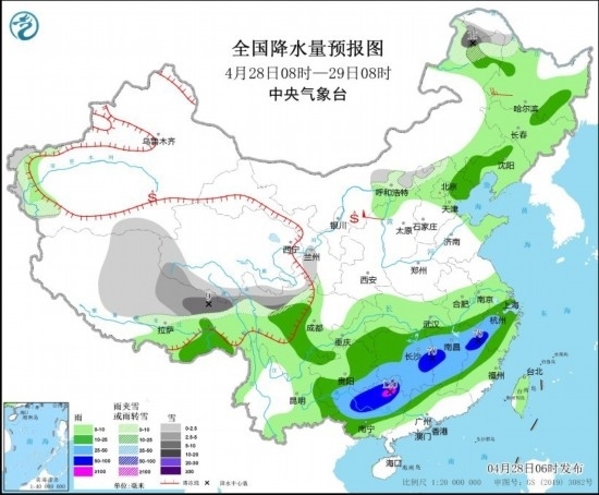 4月28日08時(shí)至29日08時(shí),內(nèi)蒙古東北部、黑龍江西北部、新疆南疆盆地西部、西藏北部和東部、青海南部和西部、川西高原北部等地部分地區(qū)有小到中雪或雨夾雪,其中,內(nèi)蒙古東北部、西藏東北部等地部分地區(qū)有大到暴雪(10~15毫米)。遼寧西部、西藏東南部、河北東北部、江南大部、西南地區(qū)東南部、華南北部和西部等地部分地區(qū)有中到大雨,其中,湖南東部、江西中北部、福建西北部、浙江西部、廣西北部等地部分地區(qū)有暴雨或大暴雨(100~120毫米)。內(nèi)蒙古中西部部分地區(qū)有4~6級風(fēng),陜西北部局地有7~8級風(fēng)。