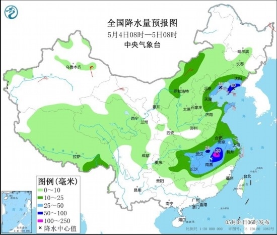 5月4日08時(shí)至5日08時(shí),湖北南部和東部、安徽南部、湖南東北部、江西中北部、浙江西部、江蘇南部以及山東半島、遼寧南部、河北東部等地部分地區(qū)有大到暴雨,其中,安徽南部、江西北部等地部分地區(qū)有大暴雨(100~120毫米)。上述部分地區(qū)伴有短時(shí)強(qiáng)降水(最大小時(shí)降雨量20~40毫米,局地可超過50毫米),局地有雷暴大風(fēng)等強(qiáng)對(duì)流天氣。內(nèi)蒙古中部、黑龍江東北部、新疆南疆盆地、甘肅河西、山東半島等地部分地區(qū)有4~6級(jí)風(fēng),其中,新疆東部部分地區(qū)有8~9級(jí)風(fēng)。渤海、渤海海峽、黃海大部、東海北部海域?qū)⒂?~8級(jí)、陣風(fēng)9~10級(jí)的大風(fēng)。