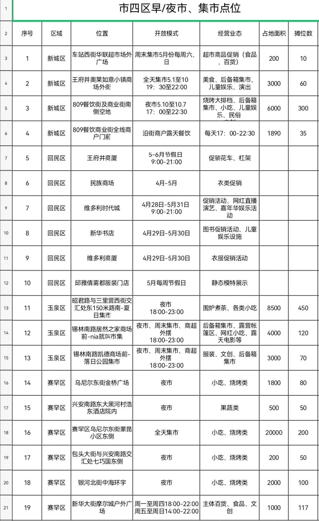 賽罕區(qū)6個(gè),包括烏尼爾東街金橋廣場(chǎng)、興安南路東大黑河村浩東酒店院內(nèi)、賽罕區(qū)烏尼爾東街蒙昆小區(qū)東側(cè)、包頭大街與興安南路交會(huì)處七巧國(guó)東側(cè)、銀河北街中海環(huán)宇的夜市、全天集市,以及新華大街摩爾城戶外廣場(chǎng)售賣主體百貨、食品、文創(chuàng)的點(diǎn)位。