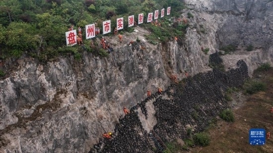 六盤水消防救援支隊(duì)隊(duì)員在進(jìn)行模擬高山峽谷救援演練(5月11日攝,無(wú)人機(jī)照片)。