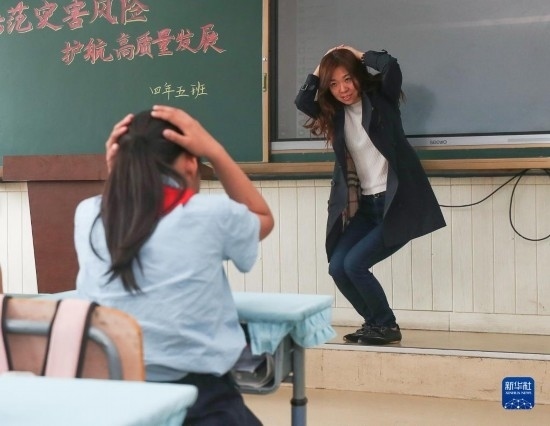 5月12日,沈陽市北塔小學(xué)的老師為學(xué)生演示應(yīng)急避險動作。