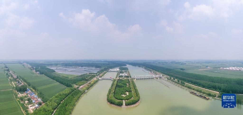 這是位于江蘇省泗洪縣的南水北調(diào)東線一期工程泗洪站樞紐(無人機全景照片,5月12日攝)。新華社發(fā)(方東旭攝)