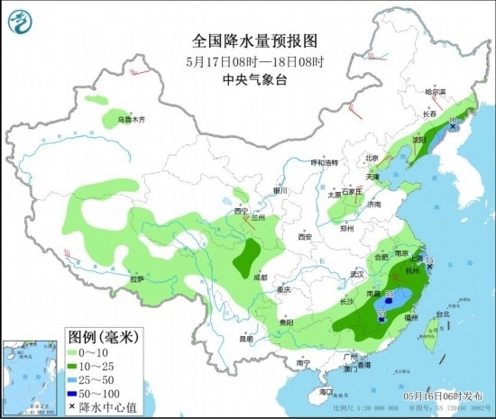 5月17日08時至18日08時,吉林東部、遼寧東部、川西高原北部、江南中東部和南部、廣東北部等地的部分地區(qū)有中到大雨,其中,江西東部、福建西北部等地局地有暴雨(50~55毫米)。新疆北疆北部、西藏南部、內(nèi)蒙古中東部、吉林東部、遼東半島、甘肅南部、河北南部和東北部、浙江中部等地的部分地區(qū)有4~6級風(fēng)。