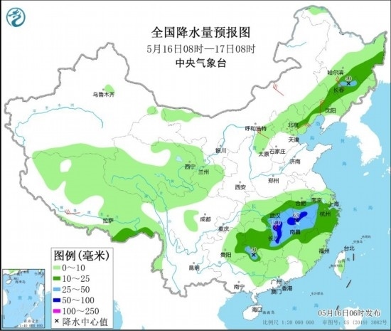 5月16日08時至17日08時,黑龍江東南部、吉林中東部、遼寧北部和西部、江漢東南部、江淮西南部、江南大部等地的部分地區(qū)有中到大雨,其中,湖北東南部、安徽南部、湖南東北部、江西北部等地局地有暴雨或大暴雨(100~110毫米)。西藏南部、內(nèi)蒙古中東部、吉林中部、遼寧西部、山西北部、河北東北部等地的部分地區(qū)有4~6級風(fēng)。