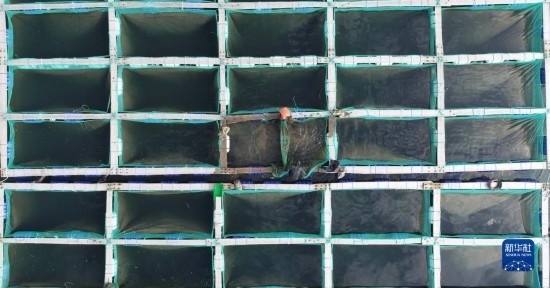 5月19日,廣鹿島鎮(zhèn)的漁民在轉運海參苗(無人機照片)。