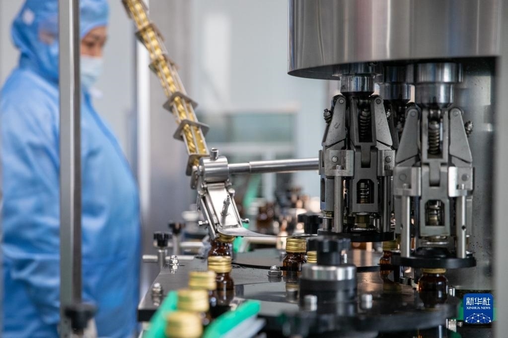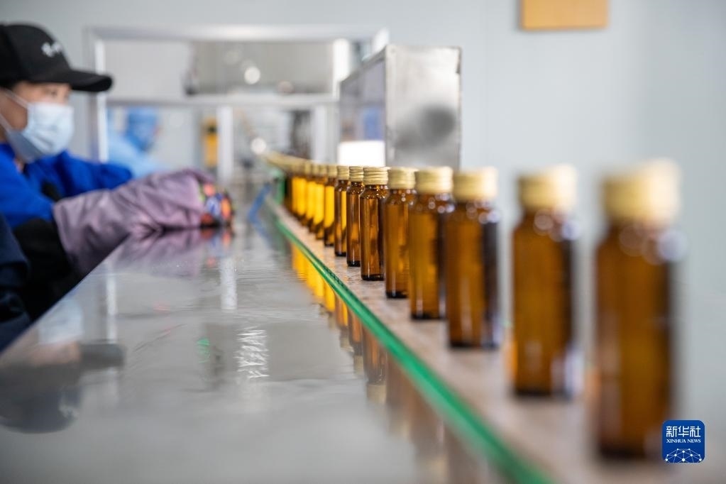 5月24日,在伊春菁樺生物科技有限公司生產(chǎn)車間內(nèi),工人在進行樺樹汁飲品灌裝作業(yè)。