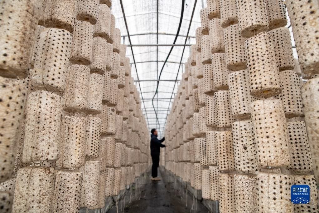 5月20日,在伊春森工集團上甘嶺林業(yè)局公司,工作人員在檢查木耳生長情況。